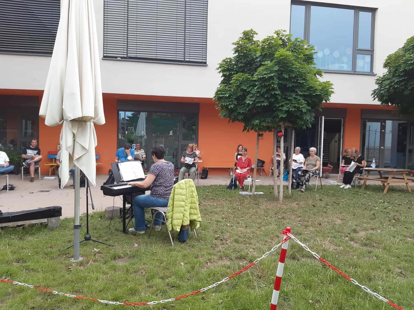 Der Hof des Kindergartens Edith Stein in Wallstadt, wo auch sonst unsere Chorproben stattfinden, erfüllt alle Voraussetzungen und ist gut geeignet. Nur einmal bei Regen haben wir die Sporthalle des Gemeindezentrums genutzt.
